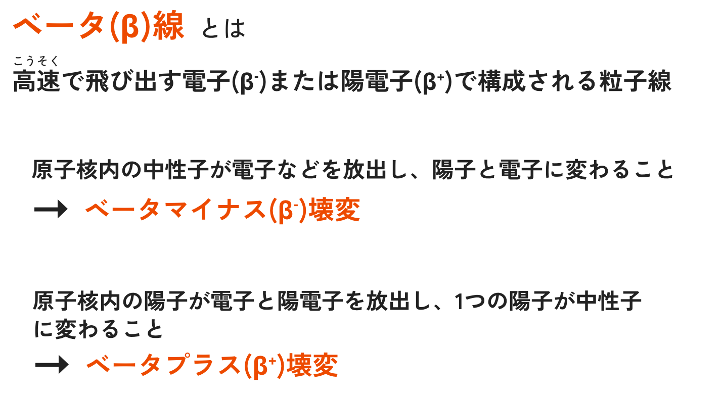 環境省のサイト「親子で学ぶ放射能サイト」の「ベータ(β)線ってなんだろう?」には、明確に「ベータ(β)線とは、高速で飛び出す電子(β-)又は陽電子(β+)で構成される粒子線