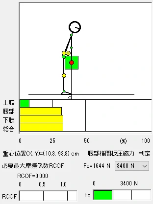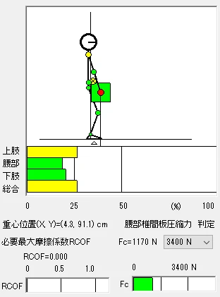 このアプリで、本問のロ~ニの場合の腰部椎間板の圧縮率を算出すると次のようになった。ただし、年齢、性別、体重、身長、膝・腰などの角度等が本問に具体的に示されているわけではないので、年齢(25歳)、性別(男性)、体重(60kg)、身長(170cm)は初期設定のままとし、膝・腰などの角度は筆者の判断で妥当と思われる数値を入力している(※)。