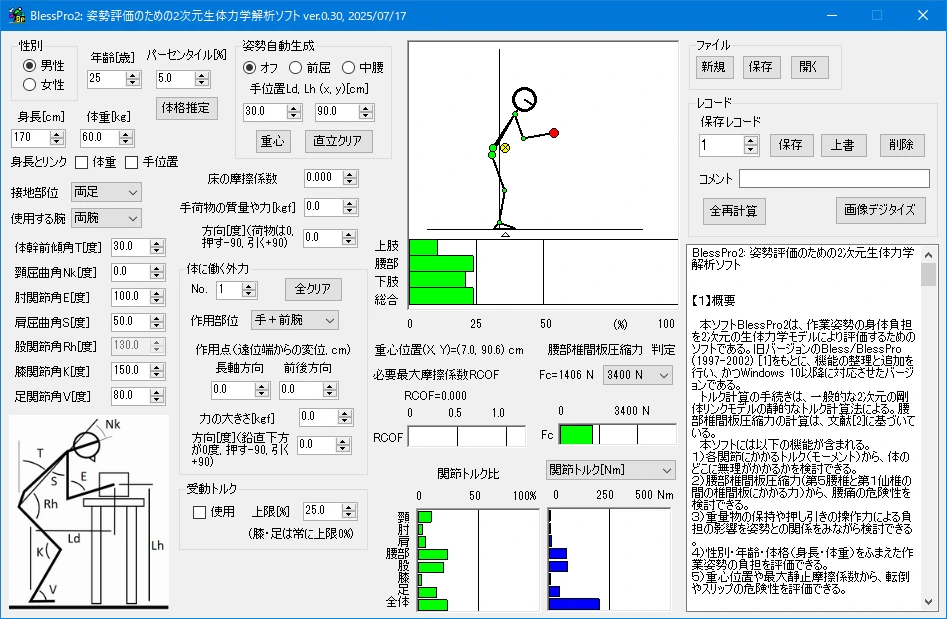 なお、最後に、瀬尾(※)が開発したアプリを紹介しておこう。これは、作業姿勢と両手に持つ荷の質量によって、腰部椎間板の圧縮率などを自動で計算できるソフトウエアで、Windows10 以降のパソコンに対応しており無料で公開されている。