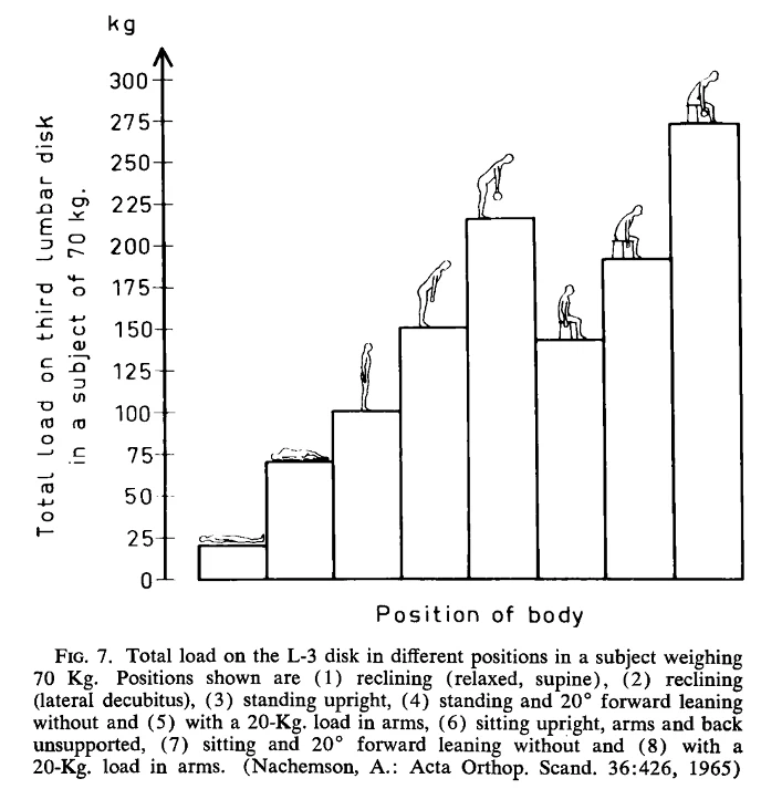 Nachemson の「体重 70 Kg の被験者の異なる姿勢における第3腰椎椎間板にかかる総荷重」のグラフ(及びTABLE 2)によると、「直立立位」のときの腰部の椎間板内圧は 99 kgであり、「背もたれを使用せず座位にて背筋を伸ばした姿勢」(イ)では 142kg となる。また、「立位にて膝を伸ばし、背を丸めて上半身を前方に傾けた姿勢」(ロ)では 148kg、「立位にて膝を伸ばし、背を丸めて上半身を前方に傾けて 20 kg の荷を手に持ったた姿勢」(ハ)では 215kg となるとされている。