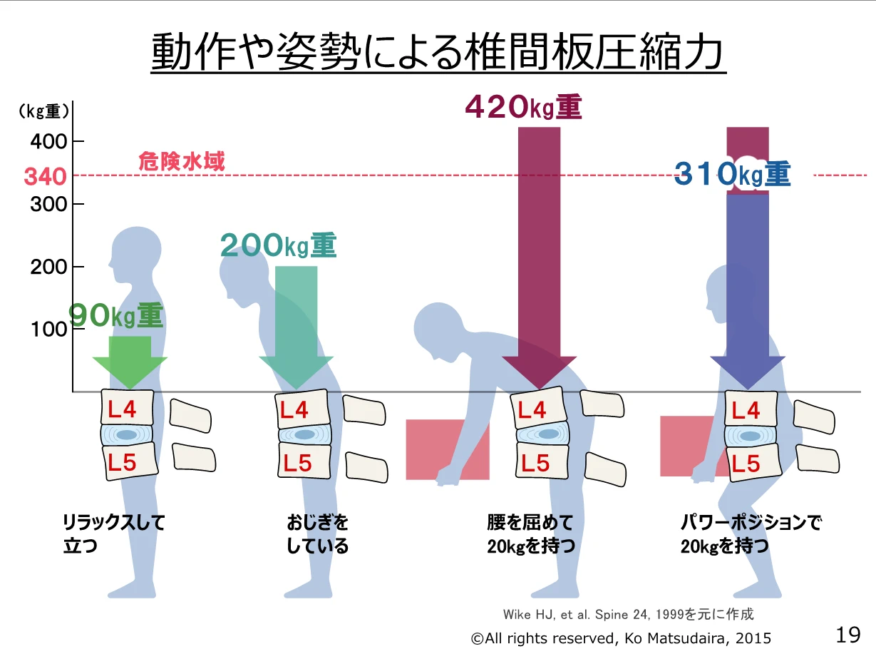 なお、具体的な数字については、前掲書の「体重の異なる個人における、異なる姿勢での第3腰椎椎間板にかかるおおよその荷重(kg)」が TABLE 2 に示されている。