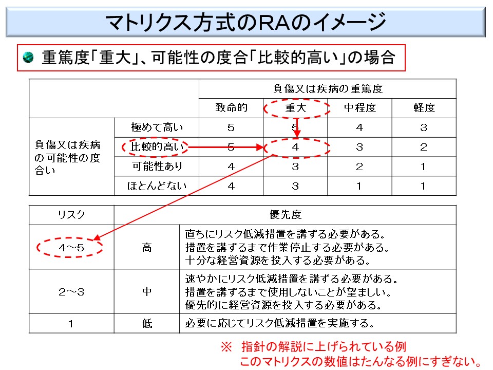 (1)マトリクス法は、危険又は健康障害の発生可能性とその重篤度をそれぞれ縦軸と横軸とした表に、あらかじめ発生可能性と重篤度に応じたリスクを割り付けておき、発生可能性に該当する行を選び、次に見積り対象となる危険又は健康障害の重篤度に該当する列を選ぶことにより、リスクを見積もる方法である。