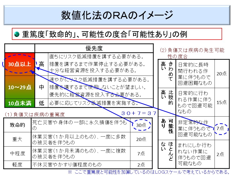 (2)数値化法は、危険又は健康障害の発生可能性とその重篤度を一定の尺度によりそれぞれ数値化し、それらを数値演算(足し算、掛け算等)してリスクを見積もる方法である。