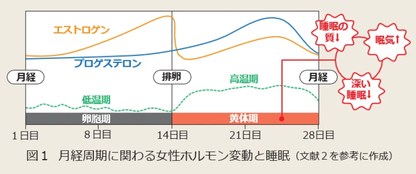 多くの女性が月経周期に関連した睡眠変化経験している。月経周期を形成・維持する代表的な女性ホルモンであるプロゲステロンとエストロゲンが、睡眠に影響していると考えられている。エストロゲン優位な卵胞期と比較して、プロゲステロン優位となる黄体期では、睡眠が浅くなるとともに、日中の眠気が強まる。この傾向は、特に月経前に心身の不調を来たしやすい人でより顕著に現れやすいと考えられている。また、月経による出血量が多いこと等で貯蔵鉄が少なくなると、レストレスレッグス症候群(むずむず脚症候群)が出現・増悪しやすくなり、睡眠を妨害することも知られている。閉じる