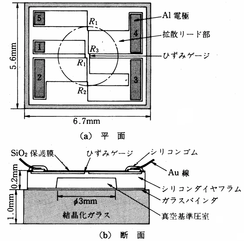 図は、五十嵐(※)による「拡散型圧力センサの基本形」であり、半導体圧力センサを「シリコン基板を加工して受圧ダイアフラムとし、その表面に前述の拡散型ひずみゲージを、IC 製作工程と同じように拡散プレーナ技術で形成したものである