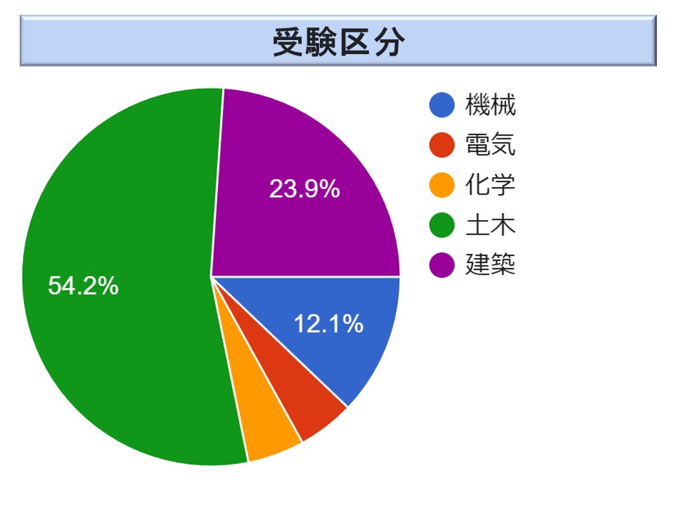 試験区分は、ほぼ昨年と同様な傾向であるが、土木が 54.3 %(2023年度 58.7%以下カッコ内は 2023 年度の値)と過半を占めているが2年連続の減少となった。その他は、建築が 22.7 %(16.4 %)、機械が 11.8 %(12.1 %)、化学 5.3 %(6.0 %)、電気 5.9 %(6.7 %)であった。建築が急増し、化学がわずかに減少しているが、いずれも昨年の反動だろう。