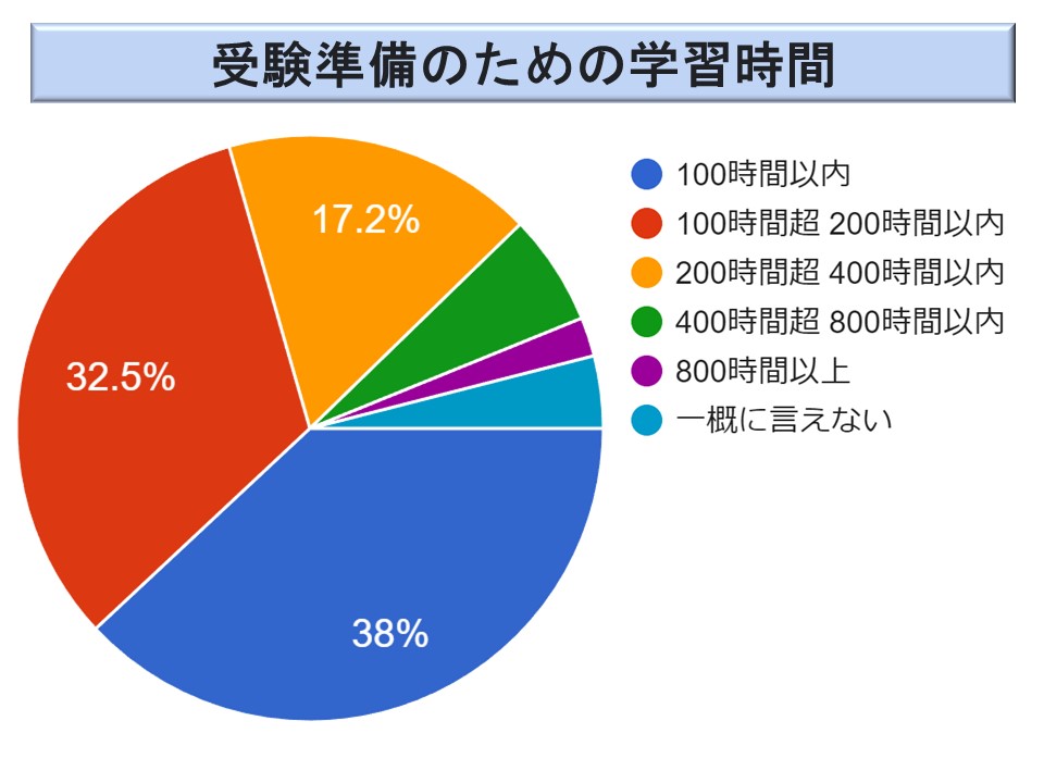 ただ、200 時間超の方が全体で 23.7 %(20.7 %)おられ、800 時間を超えると回答した方も 1.8 %(1.0 %)おられる。やはり、多くの学習時間を費やす必要のある試験ということでもあろう。また、2025 年度は2024 年度より学習時間がやや長くなっている。
