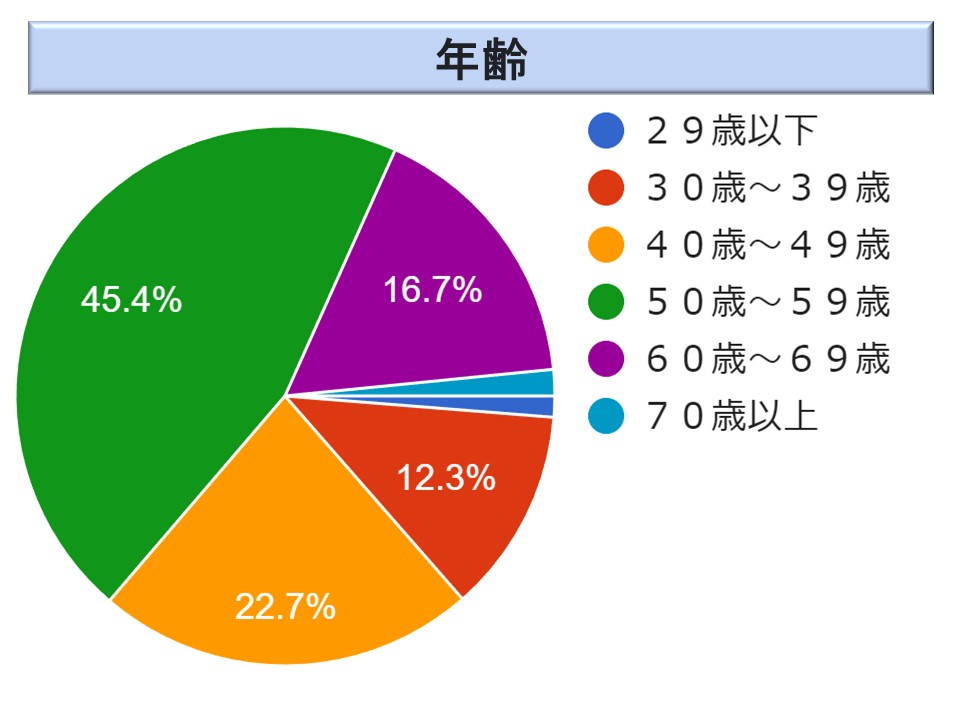 一方、60 歳代が 15.7 %(16.7 %)、70 歳代以上の方が 1.5 %(0.7 %)と高齢になっても、産業安全の分野で働きたいという希望を持たれる方も多いようである。