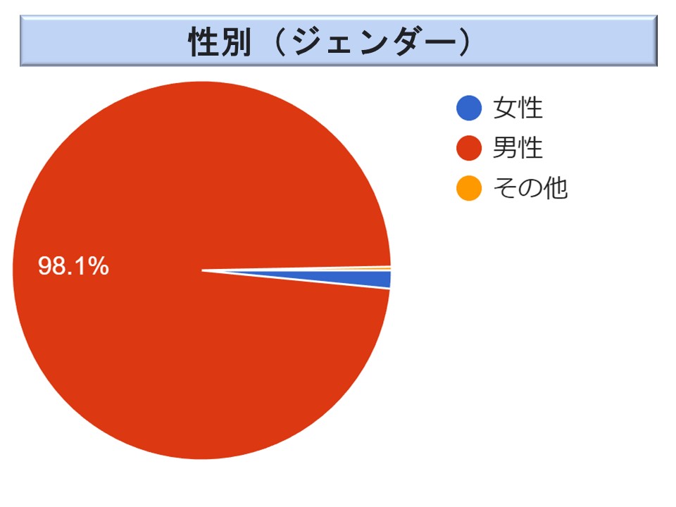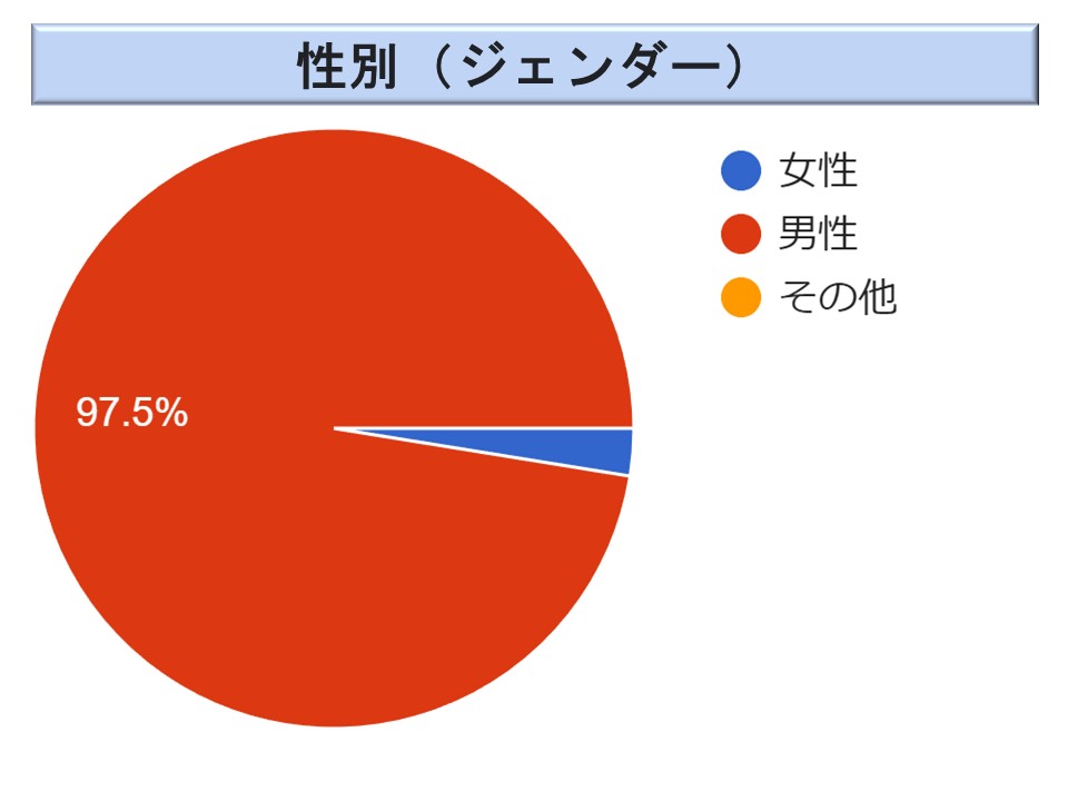 ジェンダー(性別)は314名の方に御回答を頂いている。男性が 97.5 %で女性が 2.5 %となり、その他の方が 0.0 %となっている。