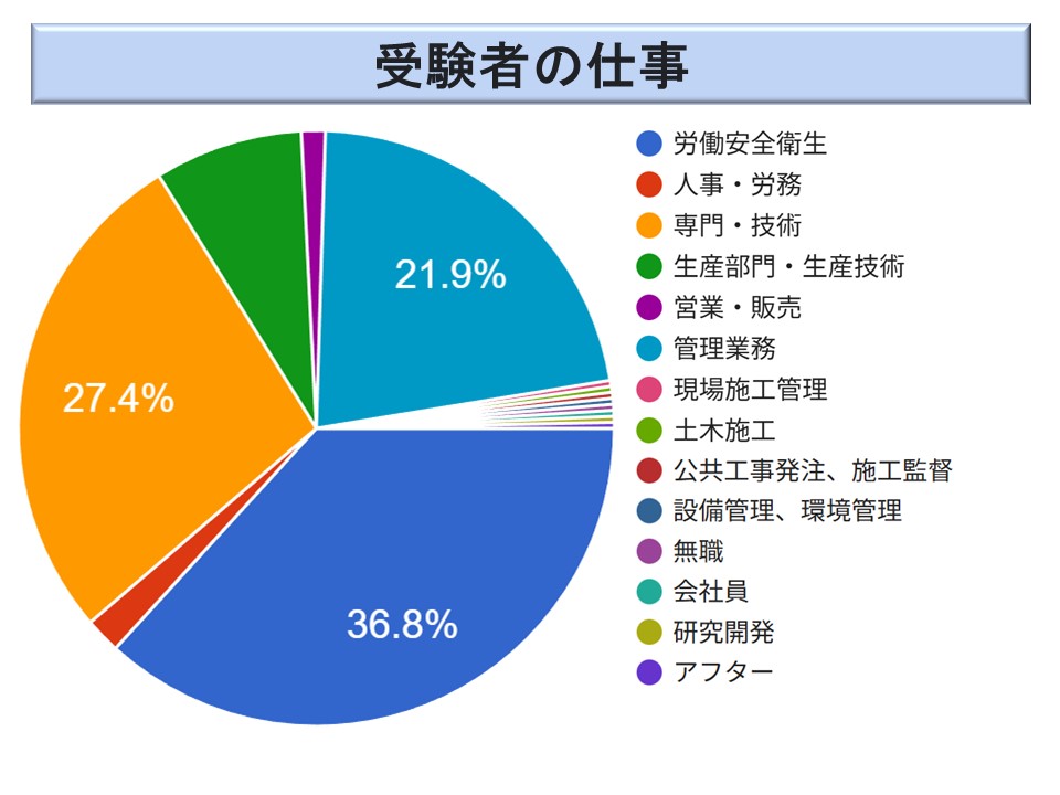 受験者は、職場の安全衛生の担当者のみならず、医師、技術士など他の分野の専門家も数多く受験しています。