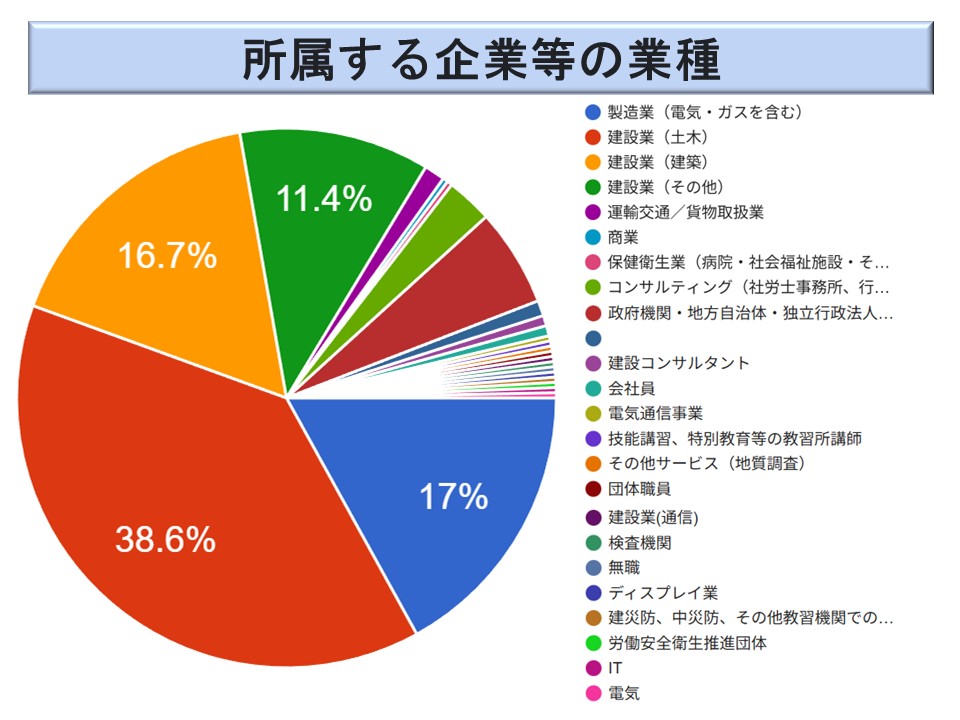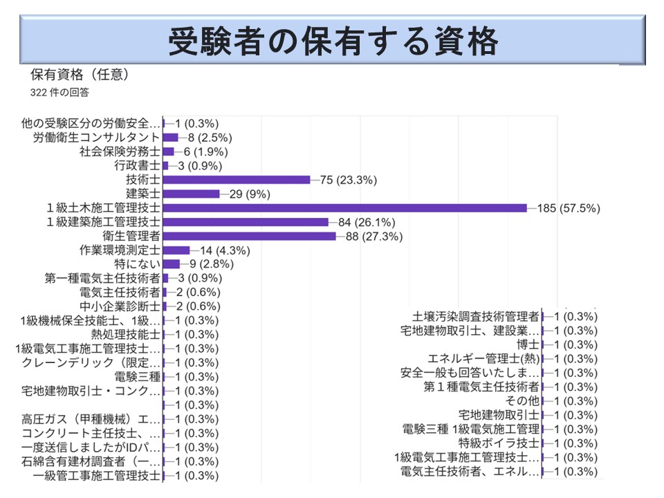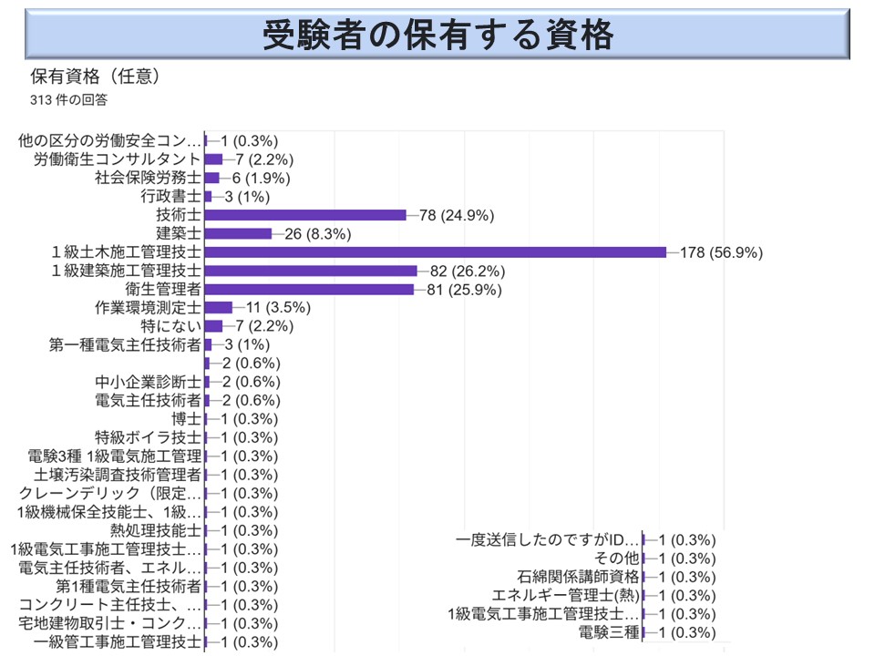 また、法律関係の資格では社会保険労務士が6名(4名)おられる。行政書士は3名(1名)となった。この他、「その他」で宅地建物取引士とした方が3名(4名)、中小企業診断士とした方が2名(2名)おられた。労働安全コンサルタント試験は、一部の法律関係の士業の多角経営の手段ともなっているようだ。