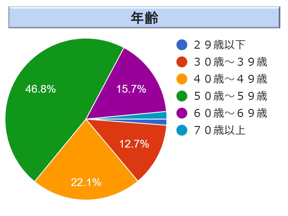意外なことに 50 歳代の方が 46.8 %(46.5 %)と半数近くを占めている。リスキリングによる退職準備という意味合いもあるのだろうか。