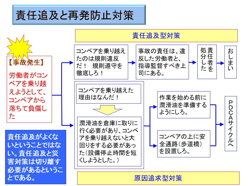 事故が発生したときの対応もこれと同じである。後になって、「あのとき、こうしていれば」とか「なぜこんな分かり切ったことに気づかなかったのか」というのは簡単である。後になって責任をとらされたからと言って、再発防止ができるようなものではないのである。