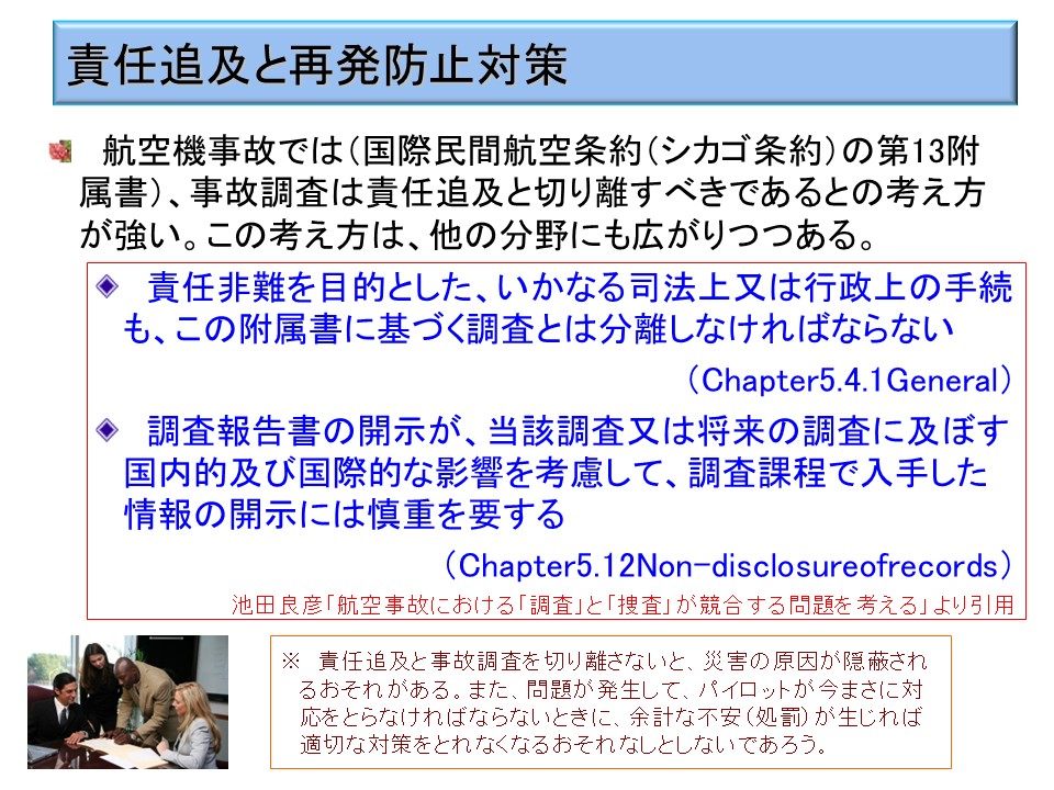 航空機事故では、国際民間航空条約(シカゴ条約)の第 13 附属書によって、事故調査は責任追及と切り離すべきであるとされている。これは、責任追及と事故調査を切り離さないと、災害の原因が隠蔽されるおそれがあるからである。