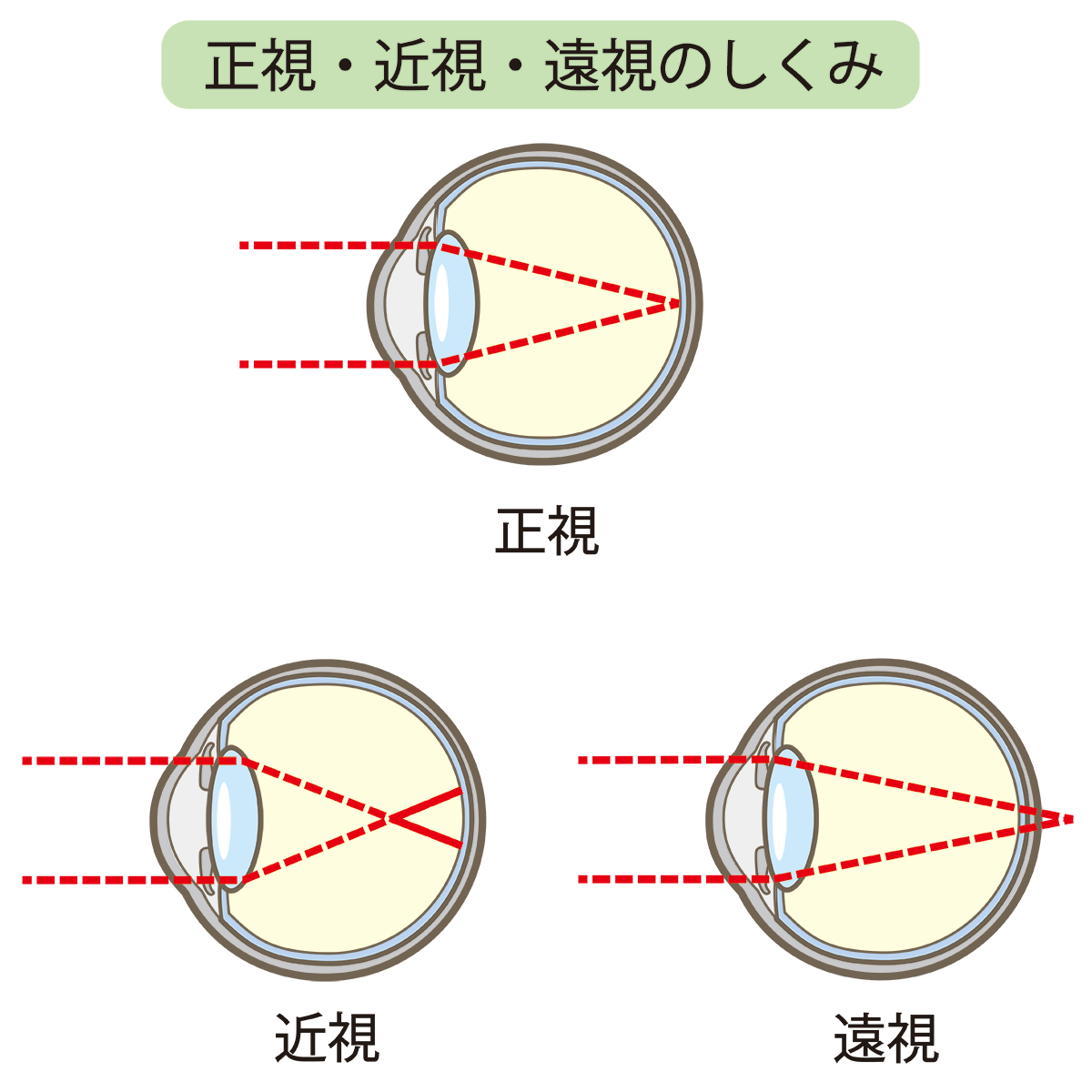 (3)誤り。近視とは、眼球内に入ってきた平行光線が網膜より前で焦点を結ぶ状態をいう。