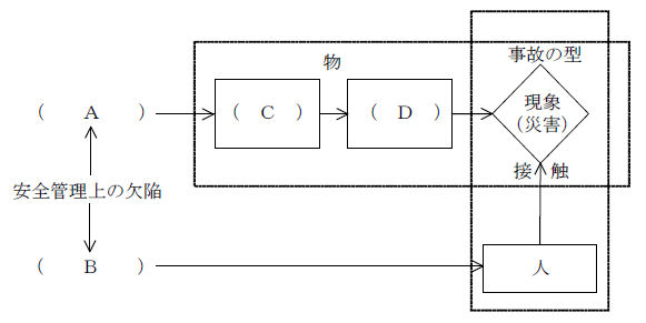 ただ、この図を知らなくとも正答することは可能である。選択肢を見ると用語は4種類である。たぶん、A ~ D にはこれらがすべて入るのではないかと想像がつくだろう。そうなると C と D は「物」とされているので、「加害物」と「起因物」のどちらかである。そして、残る A と B は「不安全な状態」と「不安全な行動」のどちらかである。
