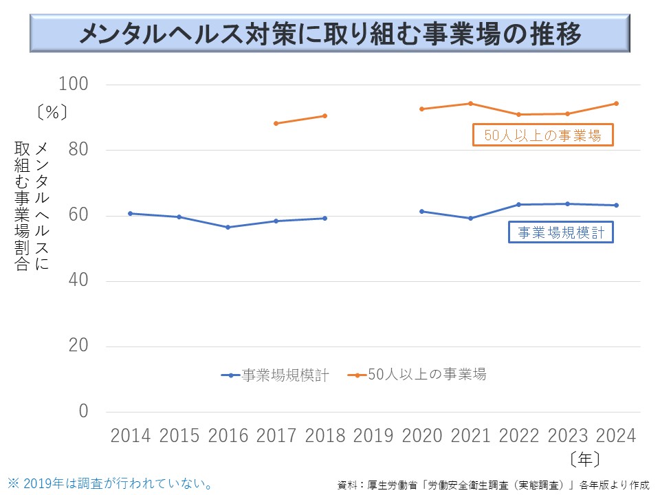 労働安全衛生調査(実態調査)による「メンタルヘルス対策」の中には、常時 50 人以上の労働者を雇用する事業場の事業者に対して、法令で義務付けられている事項(衛生委員会での調査審議(安衛則第 22 条第十号)及びストレスチェックの実施(安衛法第 66 条の 10))も含まれているのである。そのことを知っていれば、約 50 %ではあまりにも少なすぎると分かるだろう。
