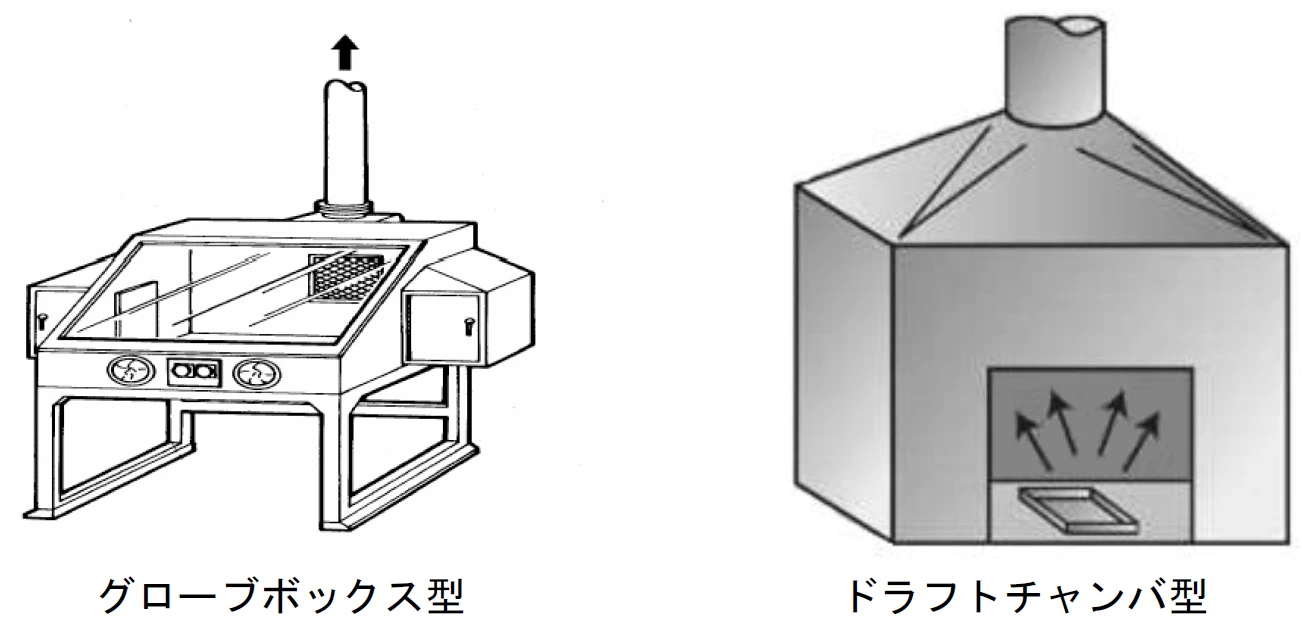型式 概要 適用例 カバー型 発散源がフードにほぼ完全に囲い込まれていて、隙間程度の開口部しかないもの 粉砕、混合、ふるい分け、撹拌、コンベア、乾燥、仕込み グローブボックス型 アイソトープの取扱い、毒ガスの取扱い ドラフトチャンバ型 発散源はフードに囲い込まれているが、作業の都合上、囲いの1面が開口しているもの 袋詰め、分析、調合、研磨 建築ブース型 溶接、粉砕、混合、撹拌、極版加工、切断、吹き付け塗装、酸洗い