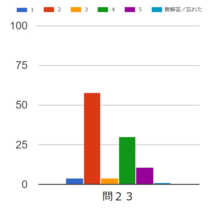 本問は、2023年度問 22 と絵表示と選択肢が入れ替わっているだけで、全く同じ種類の問題である。ただ、2023 年度の正答率が高かったのに対して、今回の正答率はあまり高くはなかった。