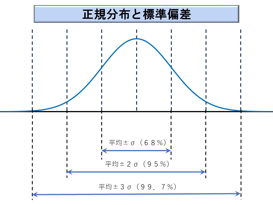 ある集団の変数が正規分布関数をしている場合、平均値±標準偏差(σ)の範囲には約 68 %の範囲のサンプルが該当し、平均値±2×標準偏差(σ)の範囲には約 95 %の範囲のサンプルが該当するのである。