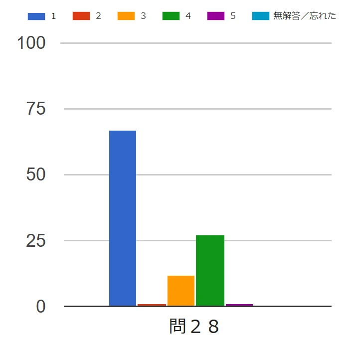 | 2024年度(令和06年度) | 問28 | 難易度 | どうとでもとれるような肢があり、正答の出しずらい問題かもしれない。ただ、正答率は低くはない。 |