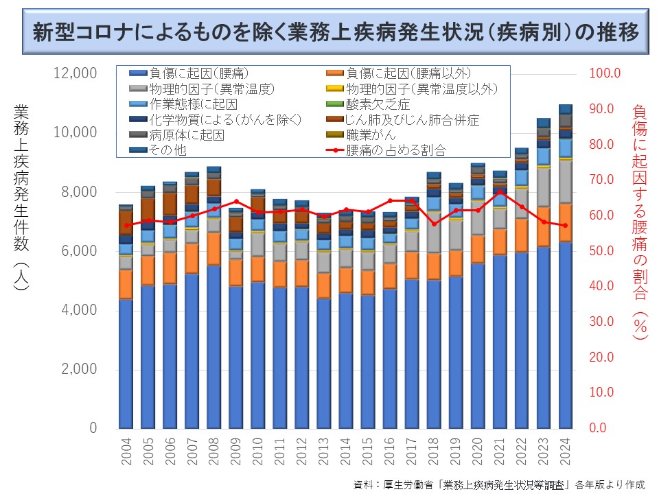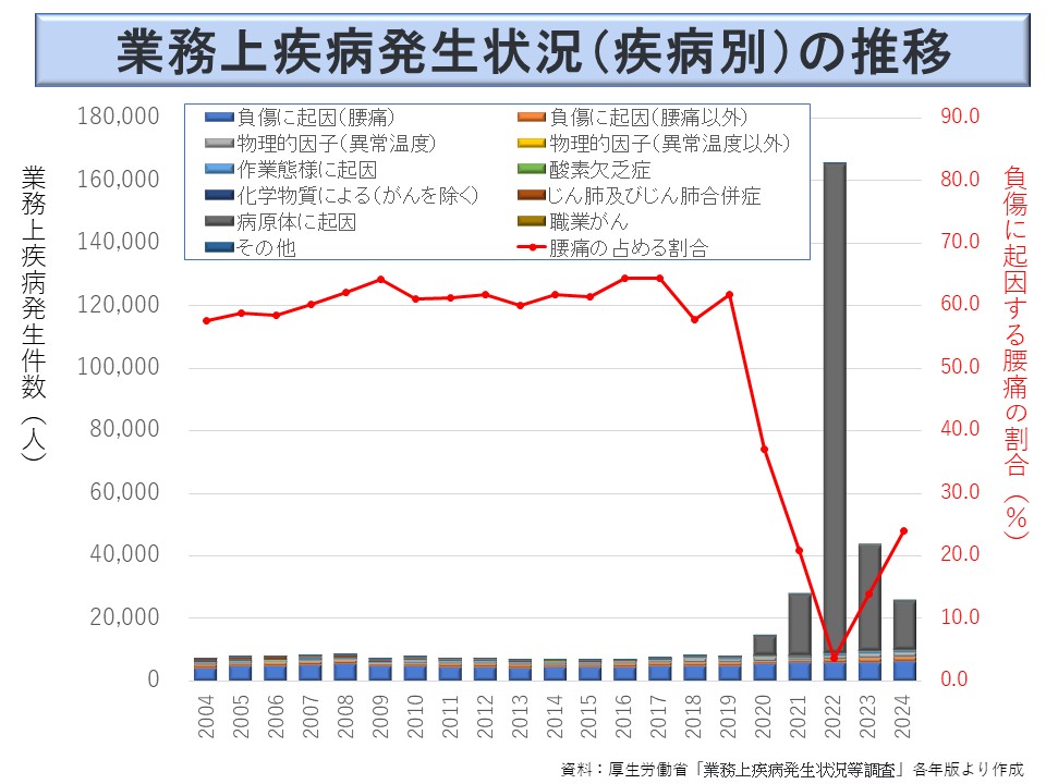 ※ 現実には、2020年以降、新型コロナによる「病原体に起因」が急増したため腰痛の割合が減少した。
