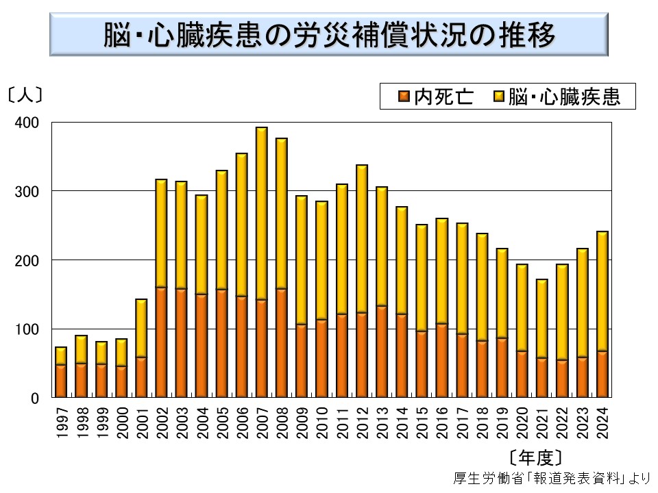 ※ 必ずしも疾病の発症や死亡時に申請されるとは限らず、また申請された年に認定されたとも限らないのは脳・心臓疾患と同様である。