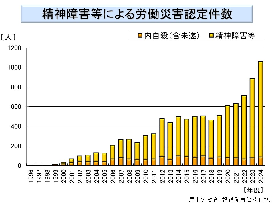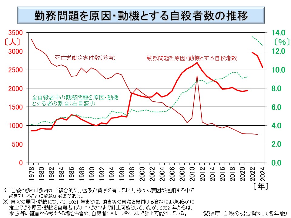 2011 年までは急速な増加傾向が見られ、死亡労働災害件数の減少もあって、2002 年以降は死亡労働災害よりも多くなっている。2012 年以降は減少傾向に転じたが、これは自殺者数全体が減少したことによるものであろう。