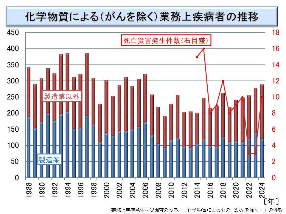 業務上疾病発生状況調査による化学物質による疾病者の数は、200名台でここ数年は減少傾向がみられず、労働者死傷病報告によると、毎年、数名の方が亡くなっている。なお、このグラフの死亡者数には、慢性疾病による死者数は含まれていない。