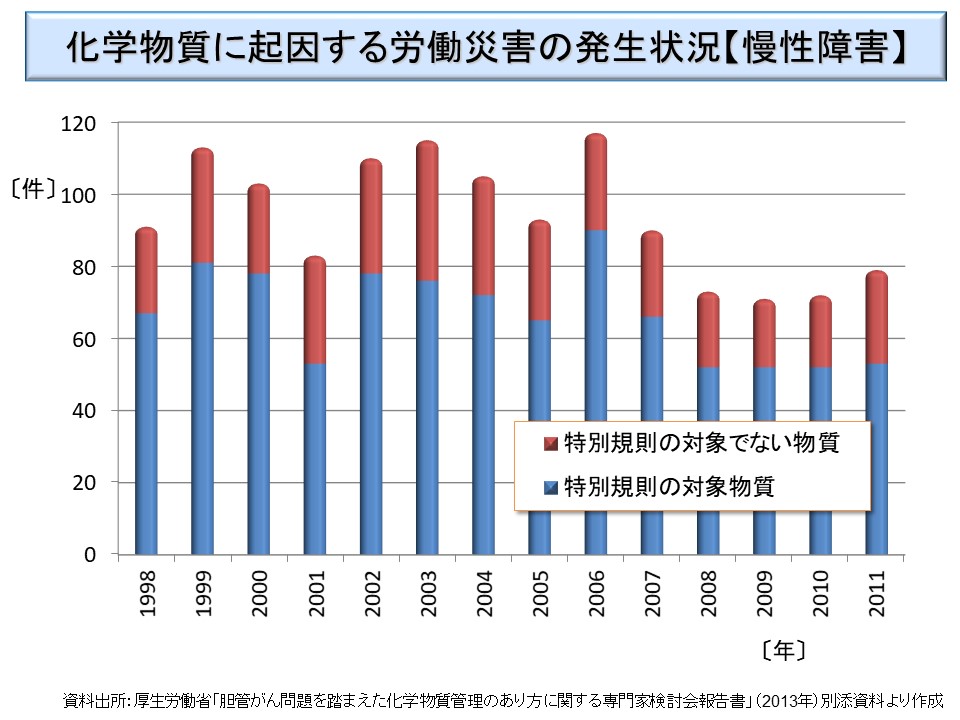 化学物質の慢性障害の発生状況は、各年の統計は公表されていない。2013 年の報告書に記されたものがあるので、参考に掲示しておく。