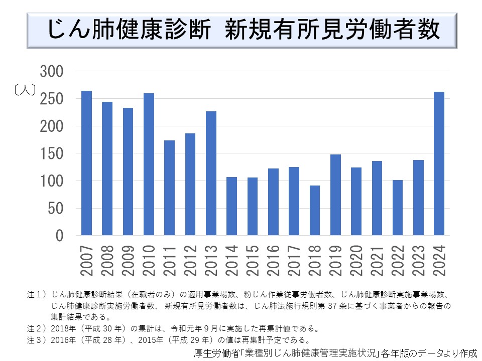また、次図にじん肺健康診断における新規の有所見者数を示す。