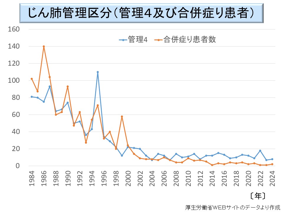 じん肺では、労災補償の対象となるのは、管理4及び合併症り患者であるが、この数も長期的には減少傾向にあり、近年では 20 名を下回っている状況にある。