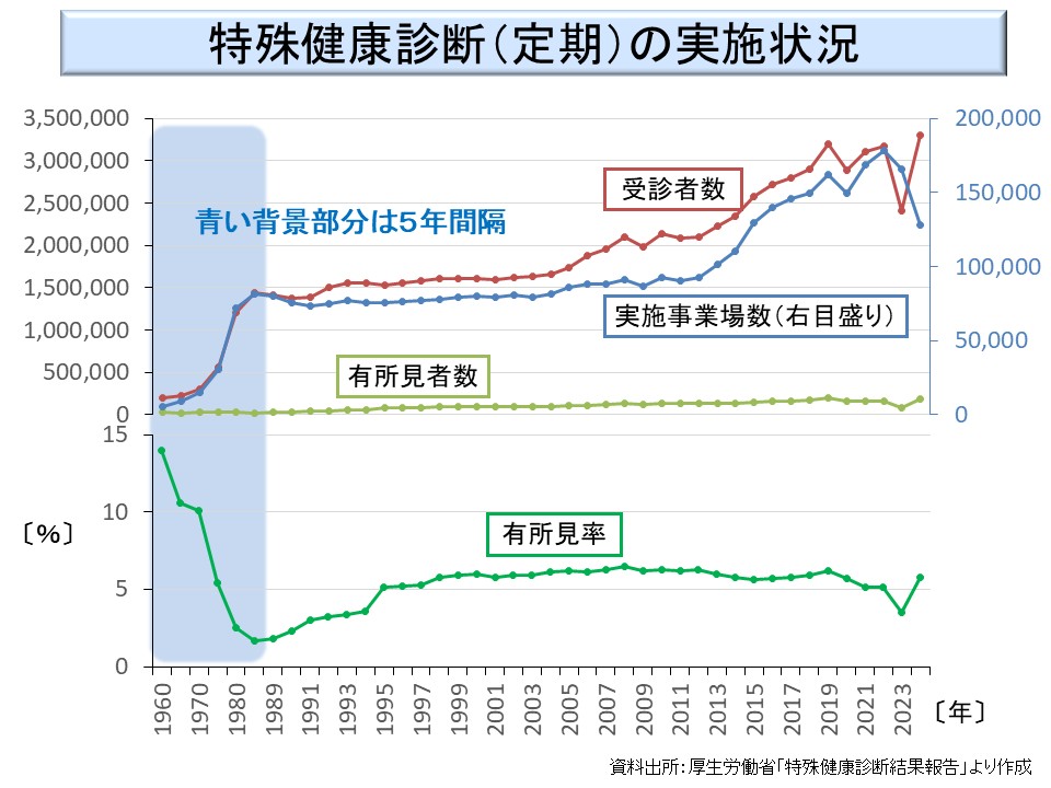 この図から分かるように、有所見率は5%程度で推移している。なお、この所見は、有害な作業による健康影響とただちに結論できるものではない。