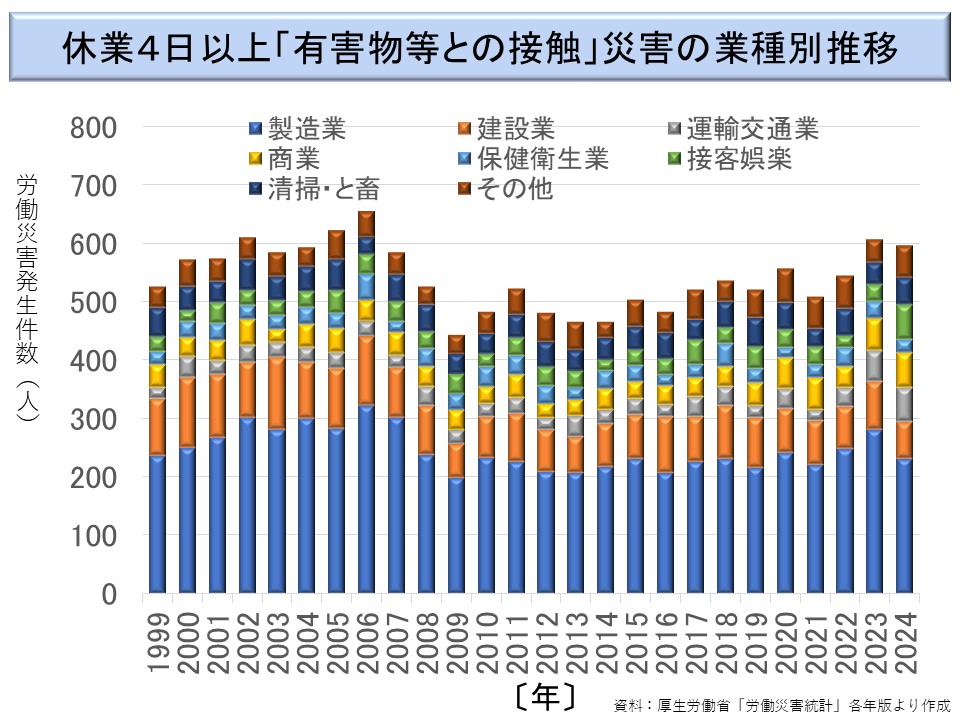 また、災害の型が「有害物等との接触」(※)である労働災害発生件数を業種別の推移は次図のようになっている。