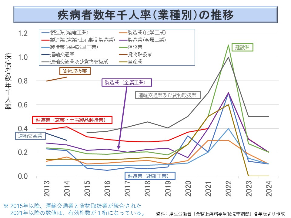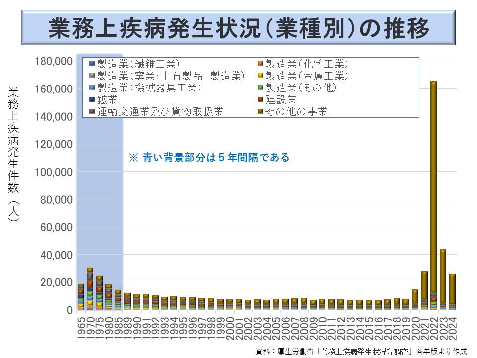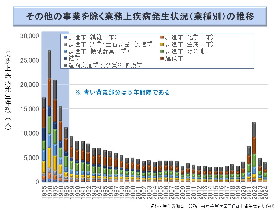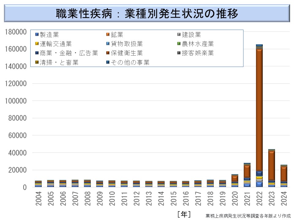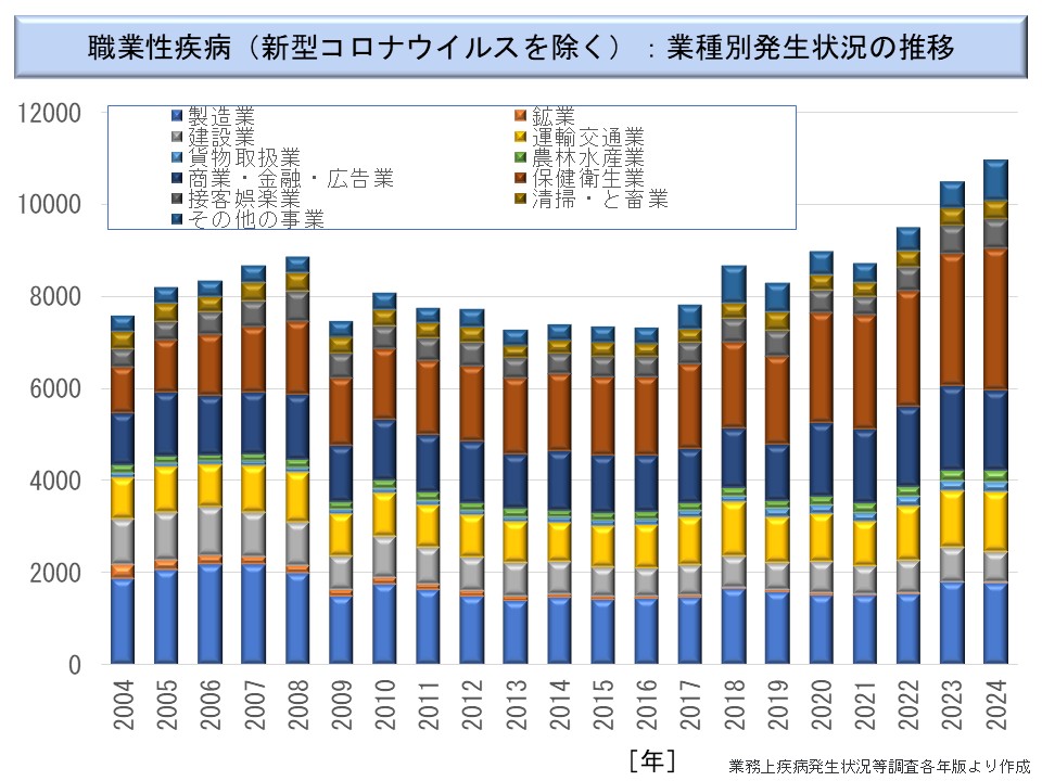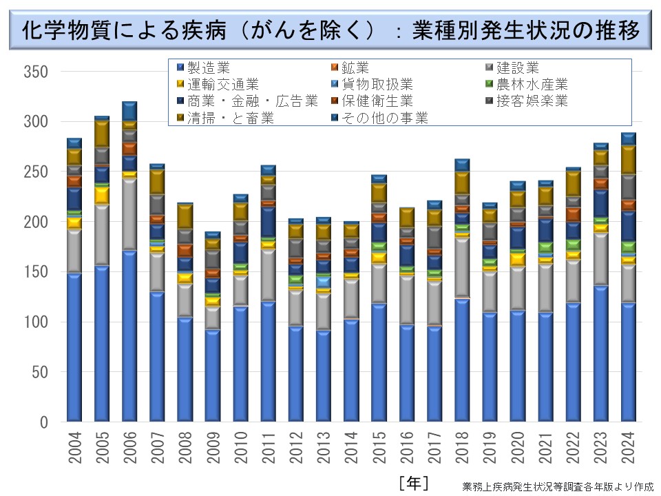 これを業務上疾病発生状況調査でみたのが次図である。同調査では、2004 年以降は製造業以外の業種の詳細が公表されている。