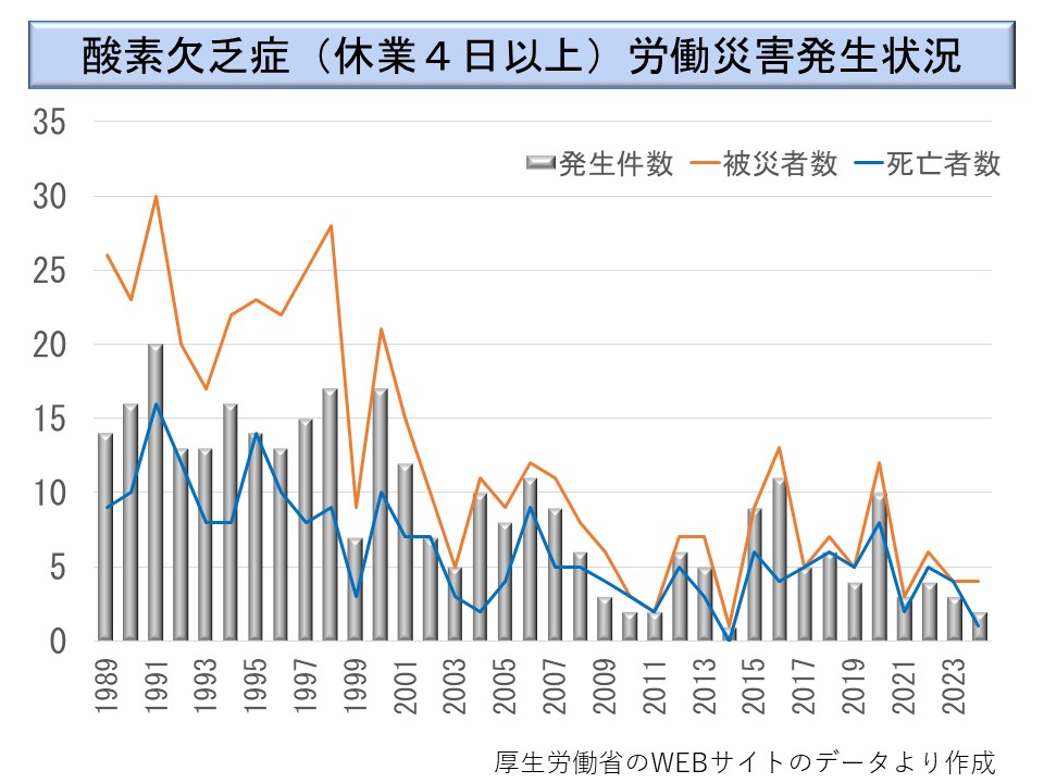 これらのグラフを見れば分かるように、災害発生件数よりも被災者の方がかなり多くなっている。酸素欠乏症や硫化水素中毒は、ひとつの事故で複数の労働者が被災する例が多いのである。