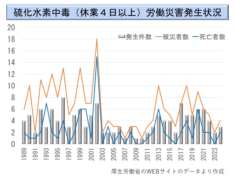 なお、労働災害統計では一つの事件で複数の労働者が発生した場合、災害発生件数は被災者の数で表している。しかしながら、酸欠・硫化水素中毒では、災害発生件数として事故の数を表すという特徴がある。