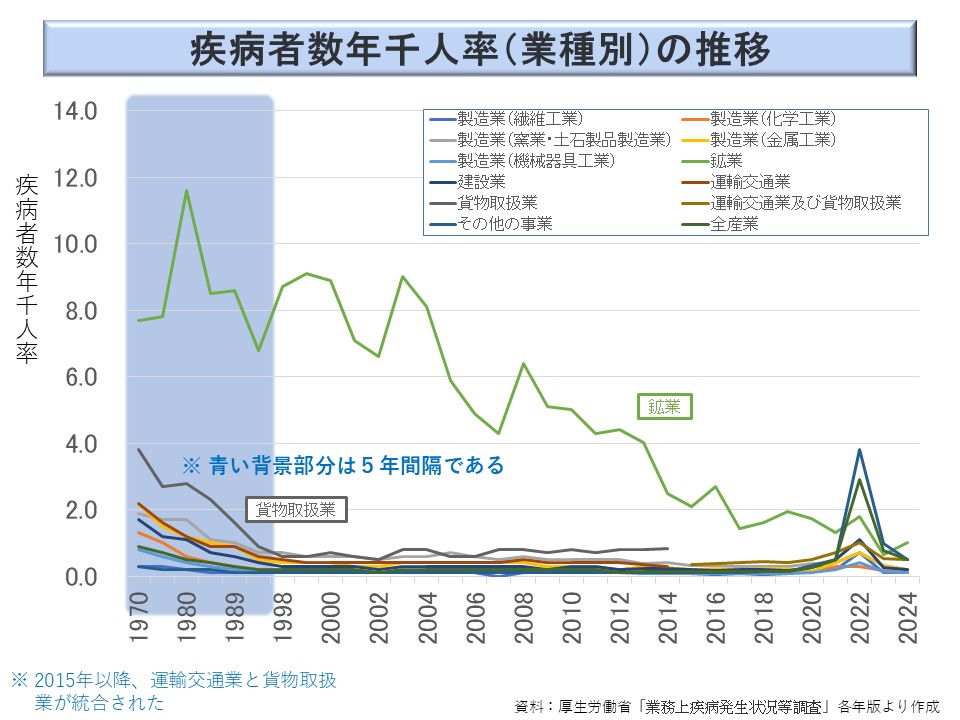 鉱業の業務上疾病の多くはじん肺及びその合併症であり、貨物取扱用では災害性の腰痛がほとんどを占める。なお、鉱業を除いた短期のグラフも示しておく。