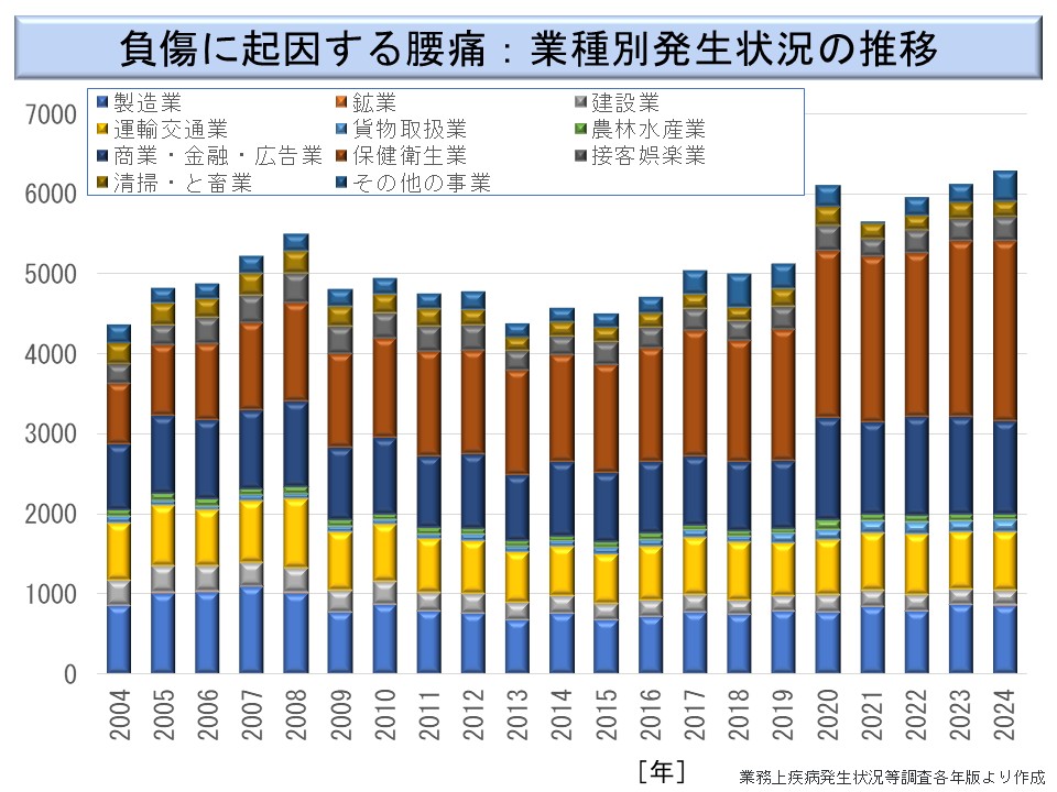 この図によると、「商業・金融・広告業」及び「保健衛生業」が長期にわたって増加していることが分かる。これは、業界全体の雇用者数の増加と、高齢化に伴って腰痛等が増加しているためである。