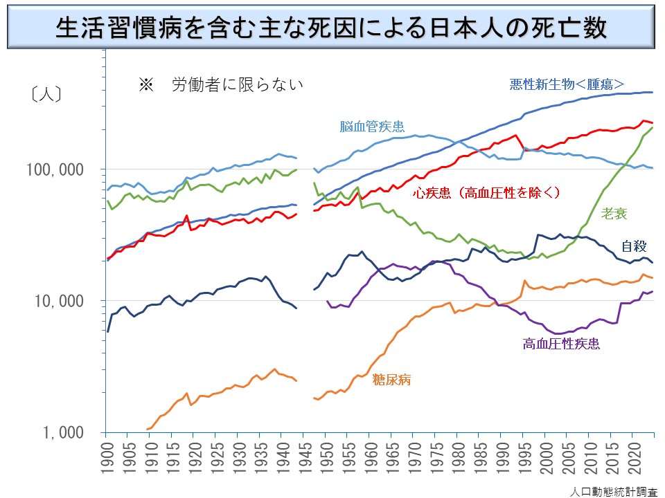 このようなことを背景として、日本人全体の死因には、いわゆる生活習慣病と呼ばれるものが増加しつつある。図は、人口動態統計による日本人の死因の長期推移である(※)。