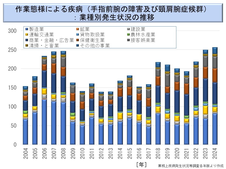 古典的な職業性疾病である作業態様による疾病(手指前腕の障害及び頸肩腕症候群)もまた、減少傾向がみられていない。