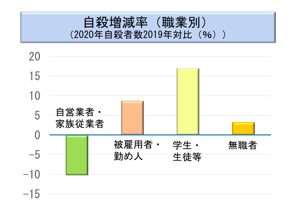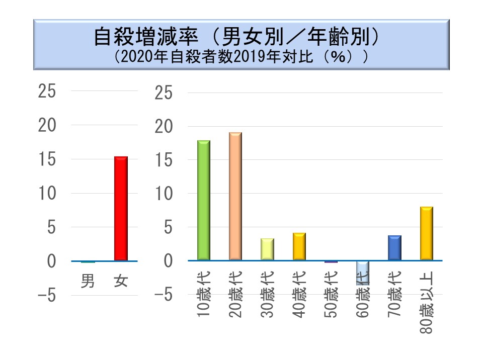 2020 年の自殺者数の増加は、コロナ禍の影響の可能性があるといわれている。男性の自殺者数がわずかではあるが減少している中で女性の増加率が目立っている。また、年齢階層別では若年者の増加が目立つ。