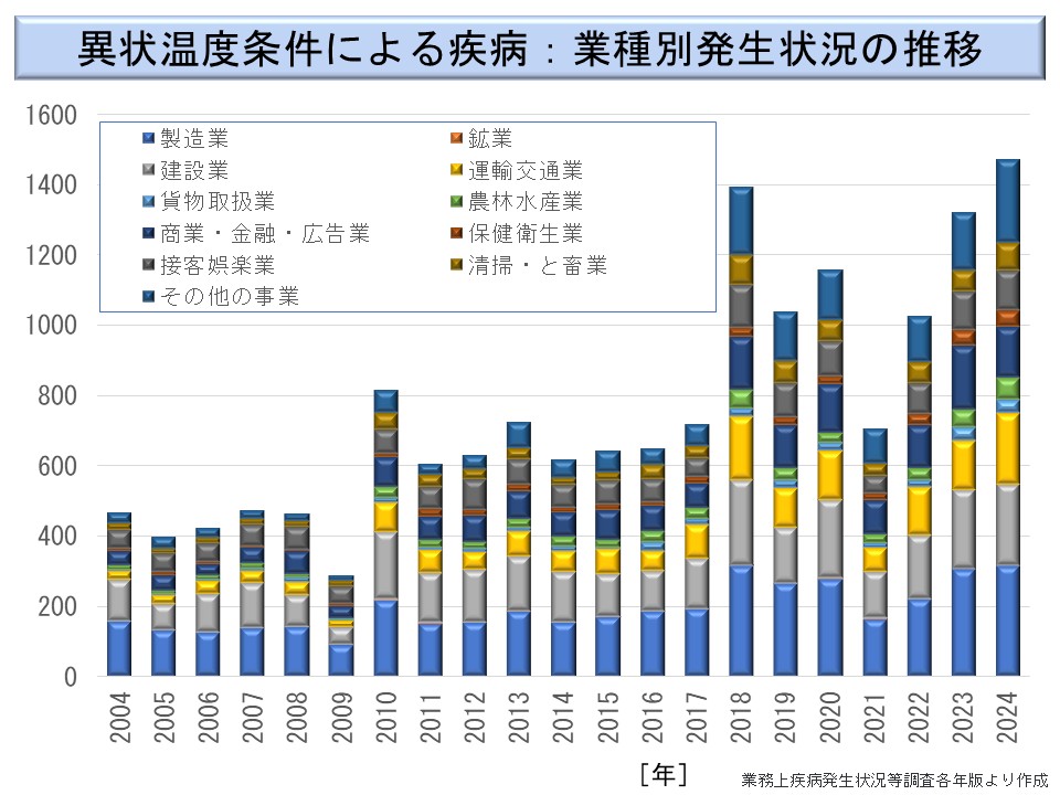 また、異常温度環境による職業性疾病が、2004 年以降の期間で急速に増加する傾向がみられている。