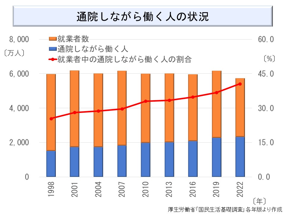 最後に、通院しながら働く人の割合の推移をお示しする。通院しながら働く人の人数は、国民生活基礎調査によって作成している。