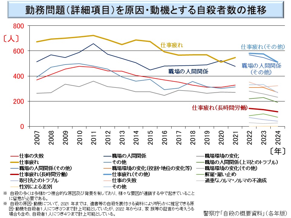 また、原因・動機が「勤務問題」であるものの原因・動機の細目別の推移は次のようになっている。この統計も 2022 年以降とその前で統計の取り方が変わっているので、ご留意頂きたい。