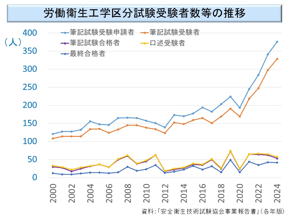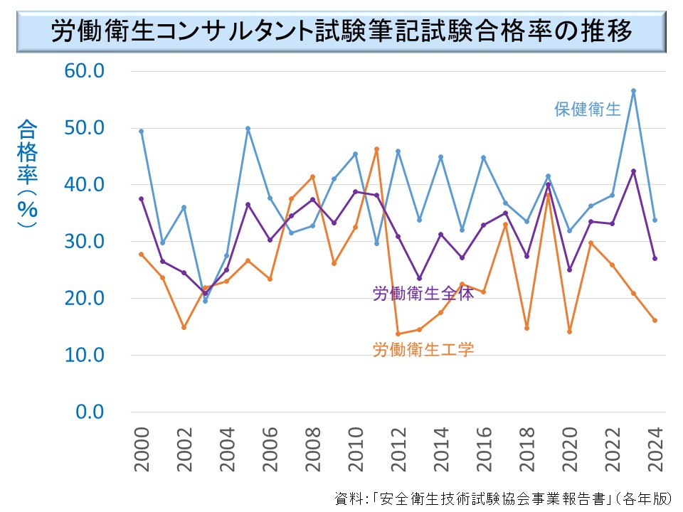 労働衛生工学の合格率は、2007 年度から 2015 年度まで及び 2022 年以降、急速に向上した。この原因は明確ではないが、2007 年は化学物質のリスクアセスメントが義務化された年であり 2022 年は化学物質の自律的管理が導入された時期である。