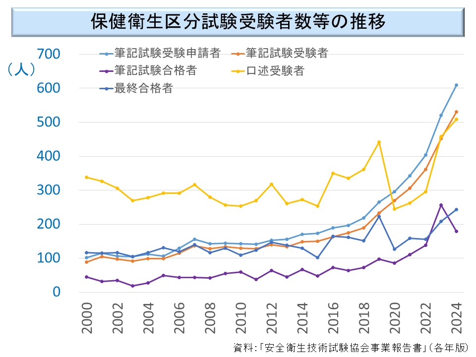 区分ごとの合格率は以下のようになっている。筆記試験は保健衛生の方が高いが、次項に示すように口述試験は保健衛生の方が低くなっている。