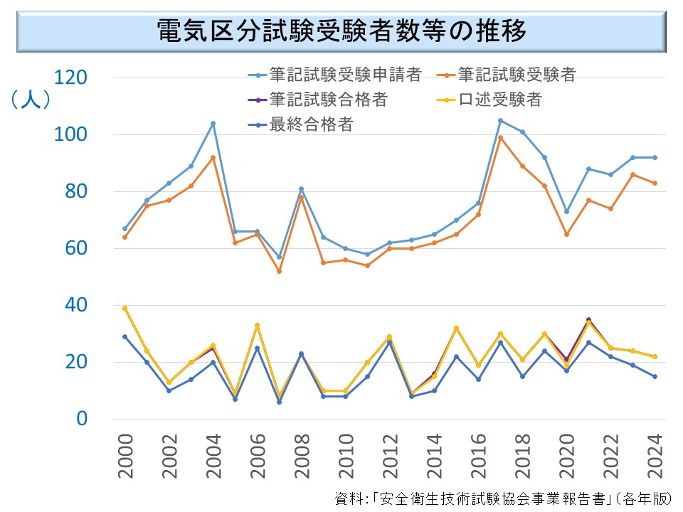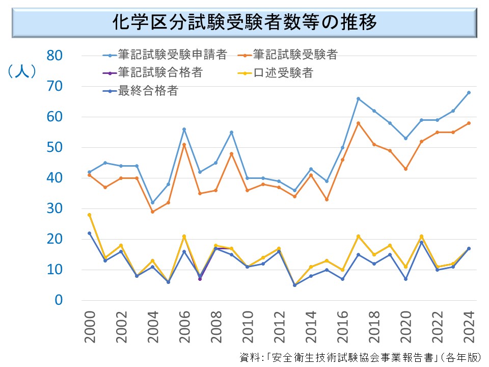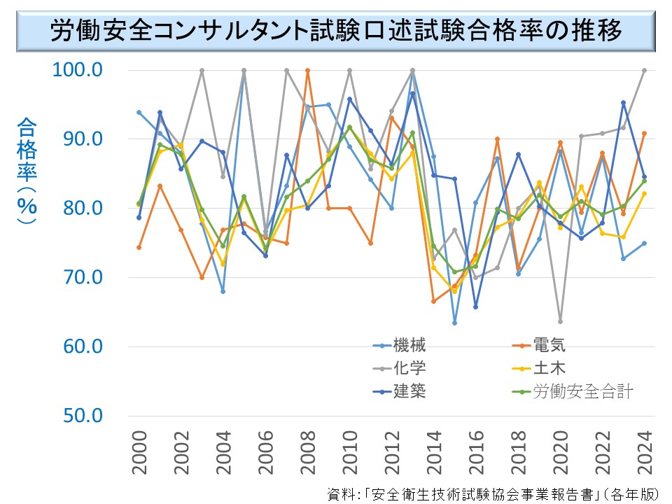一方、口述試験の合格率は右図及び次表に示すようにかなり高い。ここ数年は 80 %程度である。かつては 90 %程度だった時期もあり、受験区分によっては 100 %の年度もある。ただ、化学と電気は受験者数が十数名であり、かなり変動するのも受験者が少ないためである。