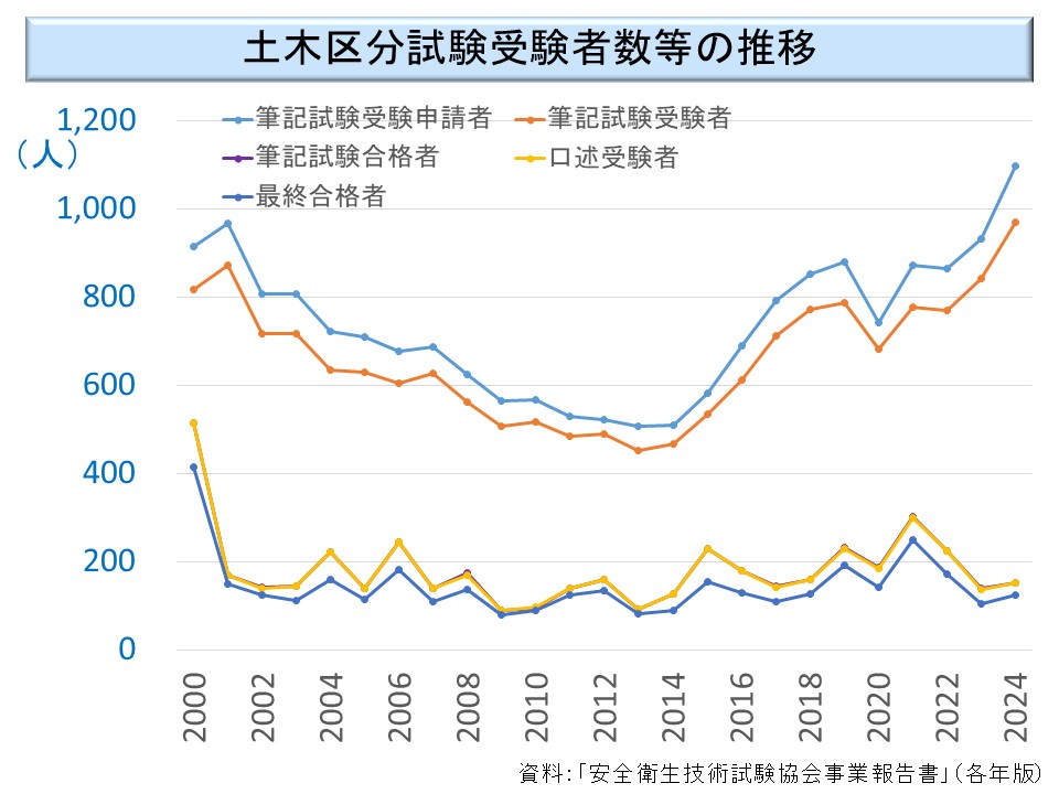 なお、すべての試験区分で筆記試験合格者と口述試験受験者の数はほぼ一致しているが、わずかに口述試験受験者の方が多い年度があるのは、かつては筆記試験全科目免除者がいたためである。