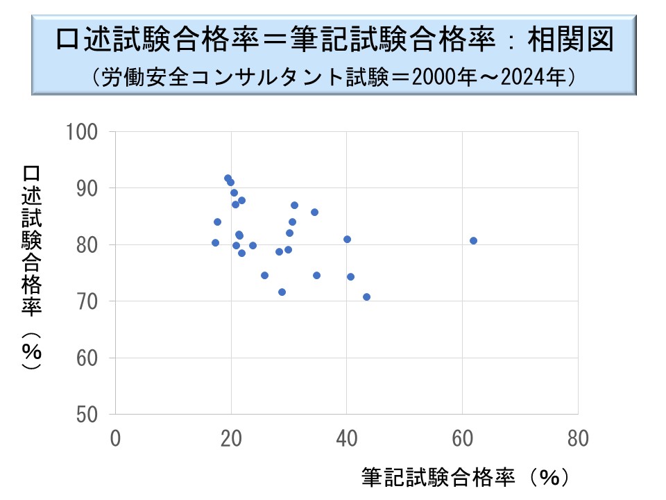 筆記試験と口述試験の合格率の相関を見ると、確かに筆記試験の合格率が高い年度は、口述試験の合格率が低くなる傾向はあるようだ。とはいえ、筆記試験の合格率が最も高い年度と最も低い年度からそれぞれ3年分の数値を除いてしまえば、相関はないといってよい。
